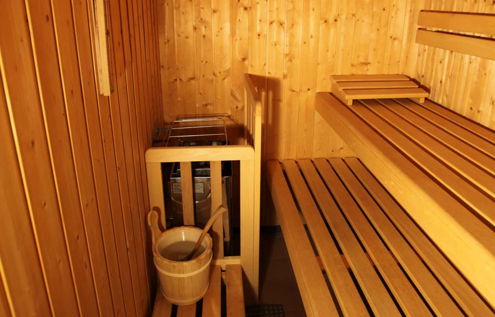 Zur Ausstattung zählt neben einer Sauna und Infrarotkabine ein Schiraum mit Schuhtrockner.